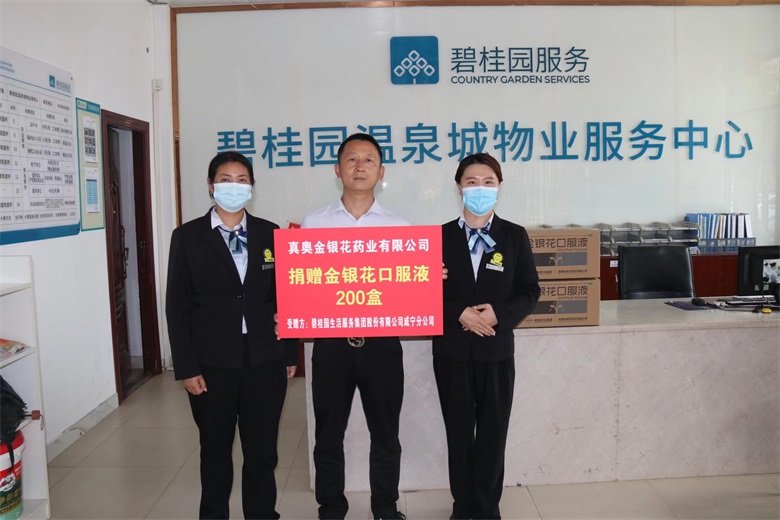 2022年11月10日,為了向奮斗在“疫”線默默付出的在崗員工表達關(guān)懷,真奧金銀花藥業(yè)向碧桂園生活服務(wù)集團股份有限公司咸寧分公司捐贈200盒金銀花口服液。